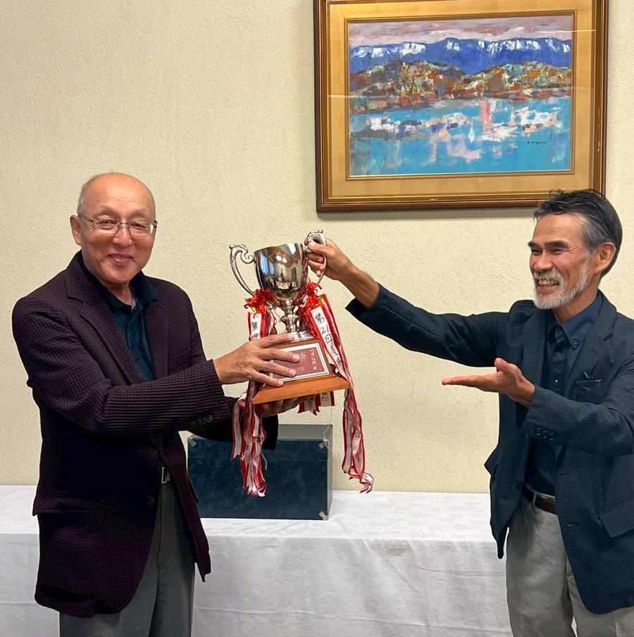 勝敗は新々ぺリア方式のハンディ戦で参加者全員のネットスコア平均で決める事とし、結果は稲門会78.3に対し、三田会79.1と僅差ではありましたが稲門会が第31回目の勝者となり、伝統の優勝カップが三田会の川並会長から稲門会丸山会長に授与されました。