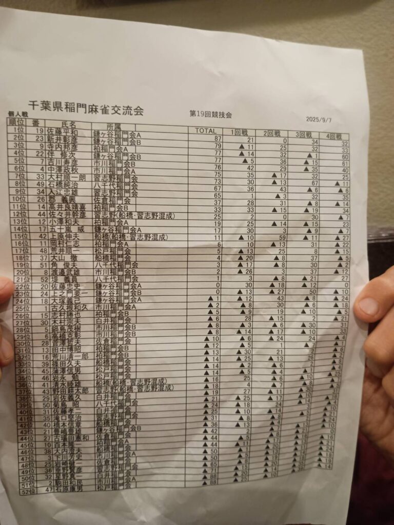 定例会は、松戸の健康麻雀主体の雀荘で月に一回(希望者多い場合2回)、4人か5人(5人の場合は一人一回ずつ抜ける)でやってます。