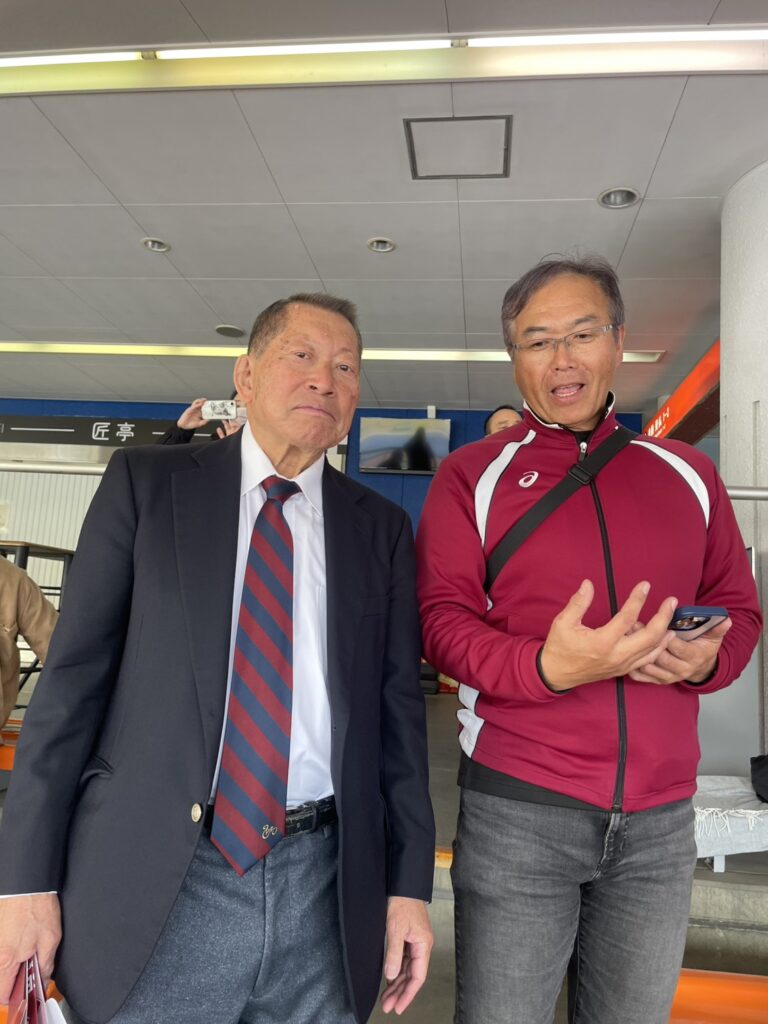 自転車部の監督がわざわざ応援席に説明に来てくださいました。OB会長もまた懇切に説明してくださったり、応援帽子をいただいたりと、大変お世話になりました。