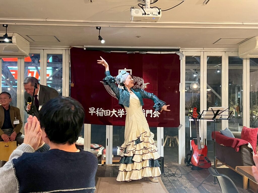 先ずは岩永さんの語りと歌で早稲田大学第二校歌「人生劇場」、続いて本橋さんのフラメンコダンスが「星のフラメンコ」の歌唱と共に鮮やかに披露されます。最後は女性会員4人によるダンスで「YMCA」の大合唱。のはずでしたが、なかなかついていけず小合唱ぐらいだったかな。